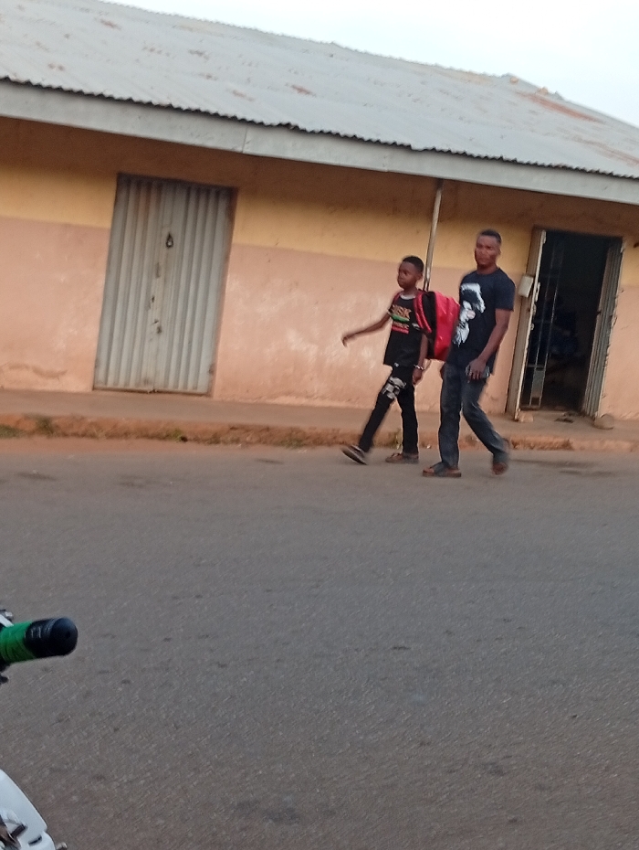 A young boy with a backpack and an adult man walk along the side of a paved road. The man wears a black t-shirt and jeans. Behind them, a tan building with a corrugated metal roof is visible. The building has two closed doors and one open doorway. A portion of a bicycle handlebar is visible in the foreground. The overall lighting suggests it's either early morning or late afternoon.