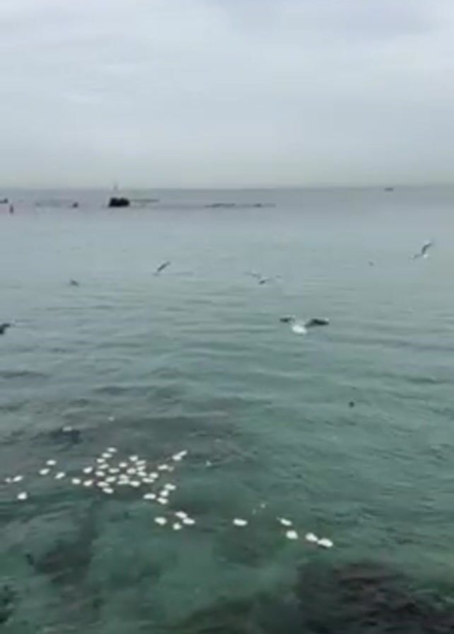 cloudy, overcast day at the sea. The water is clear with a green tint, and some white, circular objects float on the surface near the rocky shore. Seagulls fly above the water. In the distance, a rocky island with a small structure on top is visible.