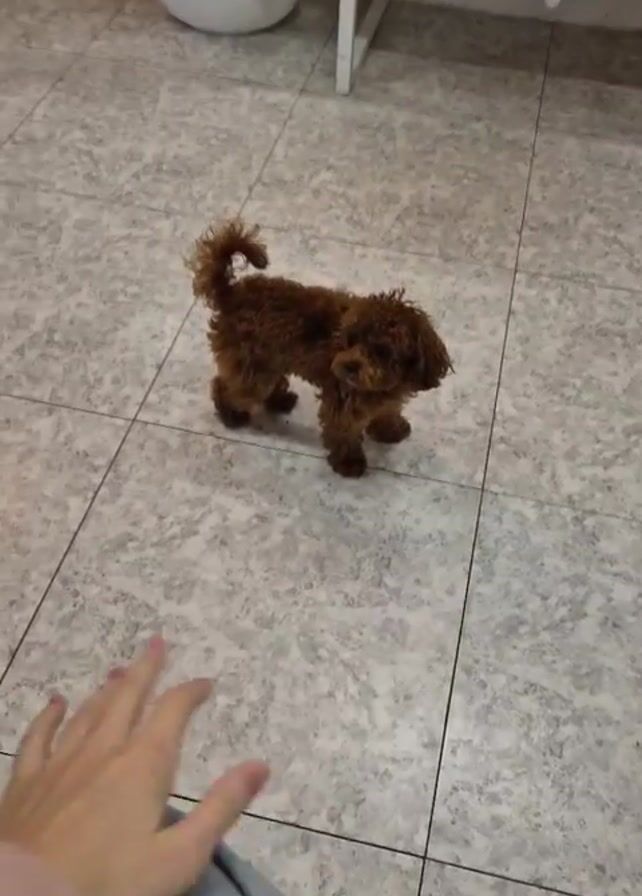 A small, brown, poodle-mix dog is standing on a tile floor, looking to the left. To the dog's left is a white planter with a green plant. Behind the planter is a brown cushion on a white bench. A leg and arm are visible in the lower left corner of the frame, suggesting a person is sitting nearby. The person holds out a hand towards the dog. The dog sits down.
