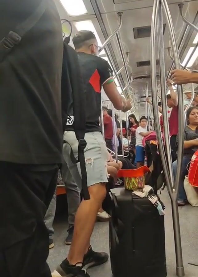 interior of a subway car filled with people. A man in ripped jean shorts, a black t-shirt with a red and green detail, and sneakers, is standing near a luggage bag, and holding a microphone. The subway car is filled with passengers of various ages sitting and standing, and holding on to the subway poles. Overhead lighting fixtures line the ceiling of the train.
