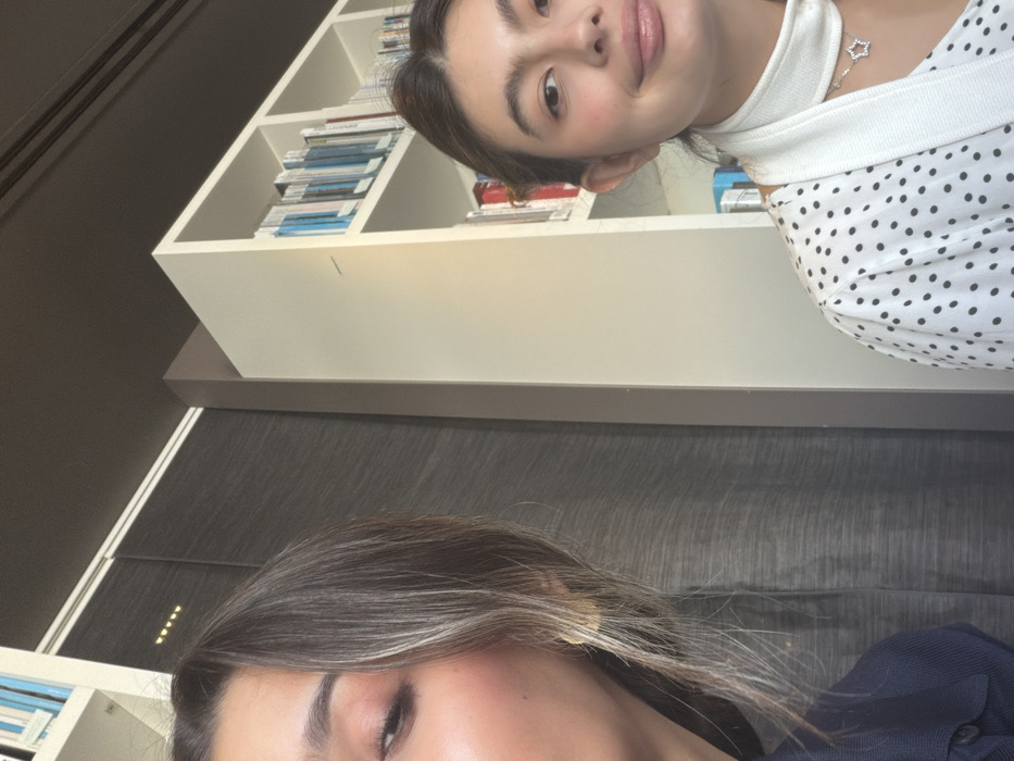 Two women are captured in an overhead shot. One, in the upper right, has dark hair and fair skin. She wears a white polka dot blouse and a white collar with a star necklace. The other, in the lower left, has light brown hair with blonde highlights and wears a dark blue top. A white bookcase with books sits behind the first woman, and a dark gray wall appears between them.