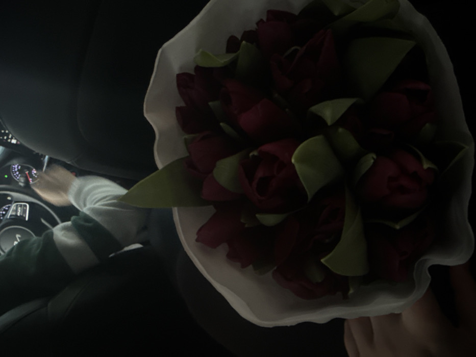 The image depicts the interior of an automobile in Saint Petersburg, Russia, observed from a rear passenger's perspective. In the immediate foreground, a bouquet of approximately 15-20 dark red or burgundy tulips with green foliage is held by a partially visible hand. The tulips are wrapped in white, textured paper. Further back, the dark-upholstered backrest of the front passenger seat is visible. In the background, the driver's seat and dashboard are present. A person is operating the vehicle, their right arm visible, wearing a long-sleeved shirt with alternating green and white horizontal stripes. Their hand is positioned on the steering wheel, which features a prominent "KIA" logo. The dashboard includes visible digital and analog gauges. The lighting conditions within the vehicle appear dim.