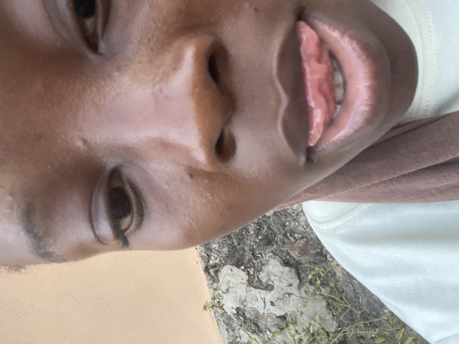 A close-up, tilted selfie shows a dark-skinned person with brown eyes and dark lashes. The camera angle focuses on the left side of their face, highlighting their nose and slightly parted lips, revealing a pink tongue. The person wears a white and brown top. The background includes a peach-colored wall on the left and a mottled gray surface with sparse greenery on the lower right.