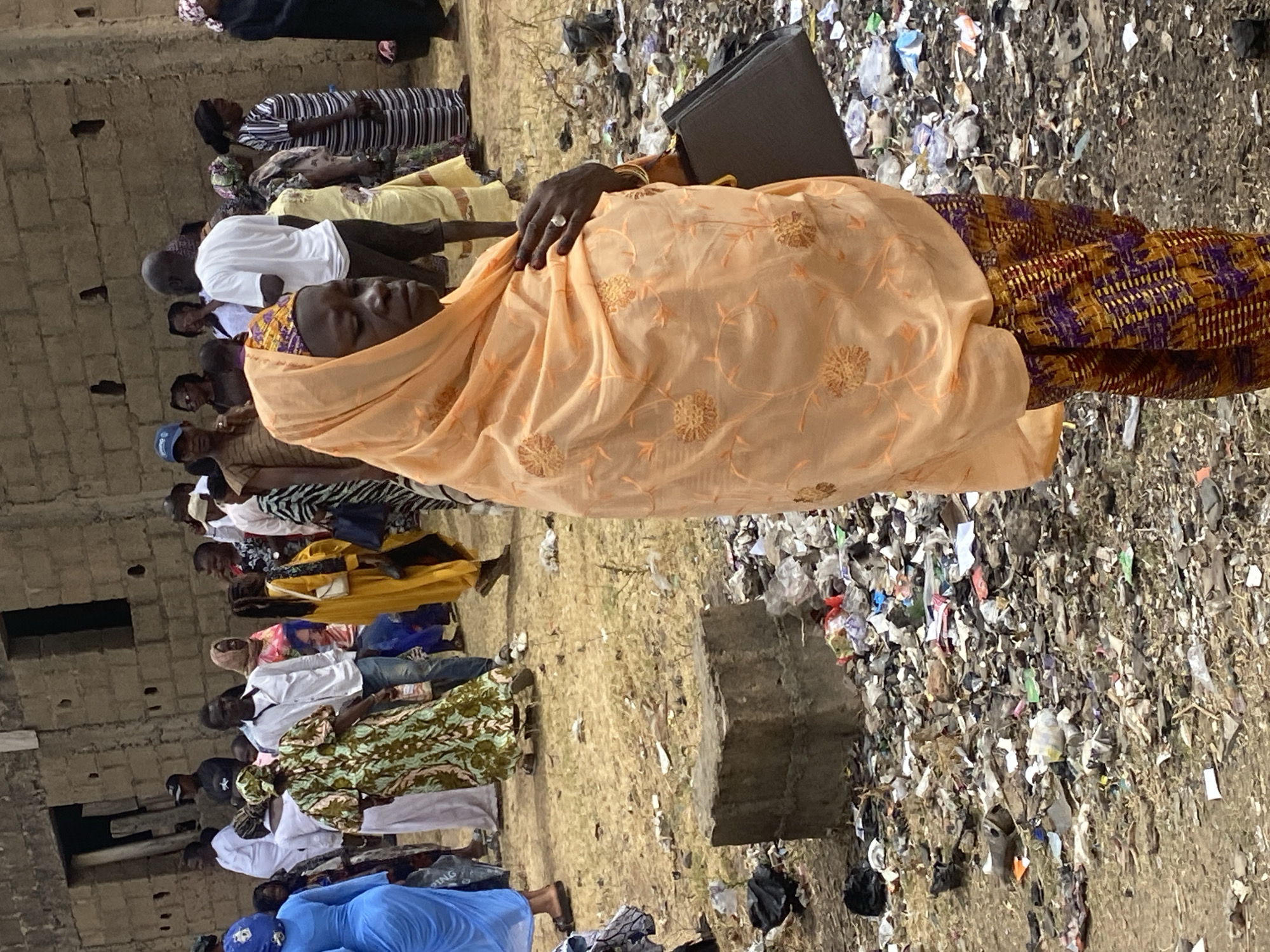 An outdoor scene on Rukuba Road, Nigeria, depicts a crowded area characterized by a large accumulation of scattered refuse. In the foreground, an adult female is positioned in profile, facing right and looking slightly downward. She wears a light orange headscarf with an embroidered floral pattern, a patterned lower garment in purple, brown, and gold hues, and a prominent silver ring on her right ring finger. Her fingernails are painted dark red. She carries a dark, rectangular bag under her left arm. Behind her, a diverse group of approximately 20-30 individuals, including men and women, are visible standing and walking. Their attire varies, including a woman in a bright blue dress, another in a green and brown patterned dress, individuals in white garments, a man in a white shirt and blue jeans, a woman in a yellow dress, and a woman in a black and white striped dress. Several individuals wear head coverings. The ground consists of dry, light brown soil with sparse vegetation, heavily littered with plastic bags, paper, and various discarded items. A single concrete block rests on the ground in the mid-left area. In the background, a two-story building constructed from rough-hewn concrete blocks stands, featuring dark, open apertures where windows or doors would be. The lighting is diffused, indicating daylight.