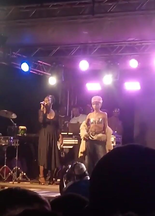 The video captures a live stage performance with two women in the spotlight. One woman, dressed in a long black dress, stands to the left of the stage while the other, in a jeweled top and a beige jacket, stands to the right, holding a white object resembling a prop. Several figures, possibly band members or stage crew, are visible behind them, situated around musical equipment including what seems to be a keyboard. The stage is illuminated with bright purple and white lights, and a glimpse of the audience can be seen in the foreground.
