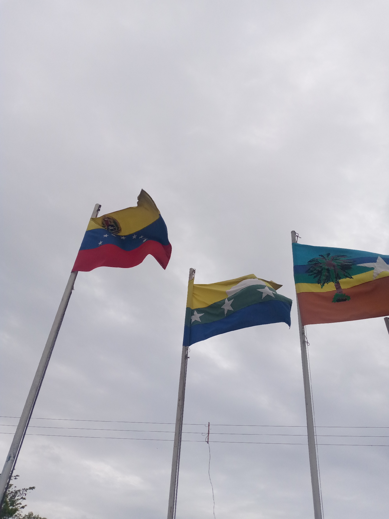Three flags wave against a cloudy sky. From left to right, the first flag displays the colors of yellow, blue, and red with an emblem and eight white stars. The second flag features horizontal bands of yellow, green, and blue with three white stars. The third flag is divided into sections of blue, yellow, brown, and orange and contains a palm tree and a large white star. Each flag is attached to a silver pole. A power line is visible in the background.