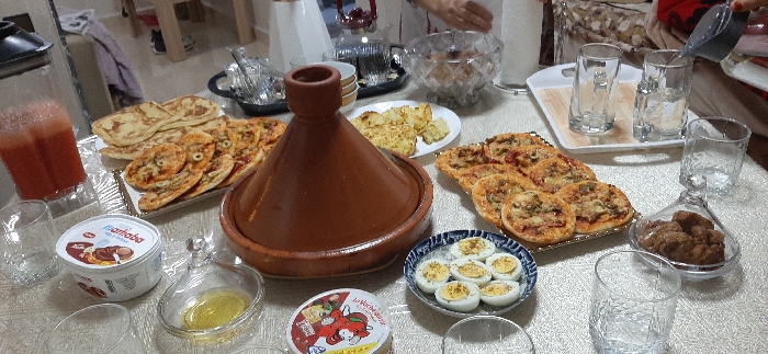The image captures an indoor table scene in Meknes, Morocco, displaying a prepared meal spread on a white patterned tablecloth