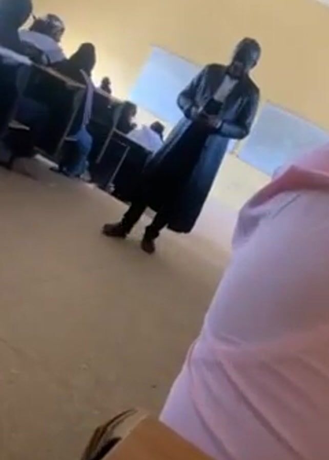 classroom. Students are seated at desks. A man in a long black coat and a cap stands in front of the class, looking at a phone in his hands. The walls of the classroom are yellow. There are whiteboards on the walls. One student is wearing a pink shirt.