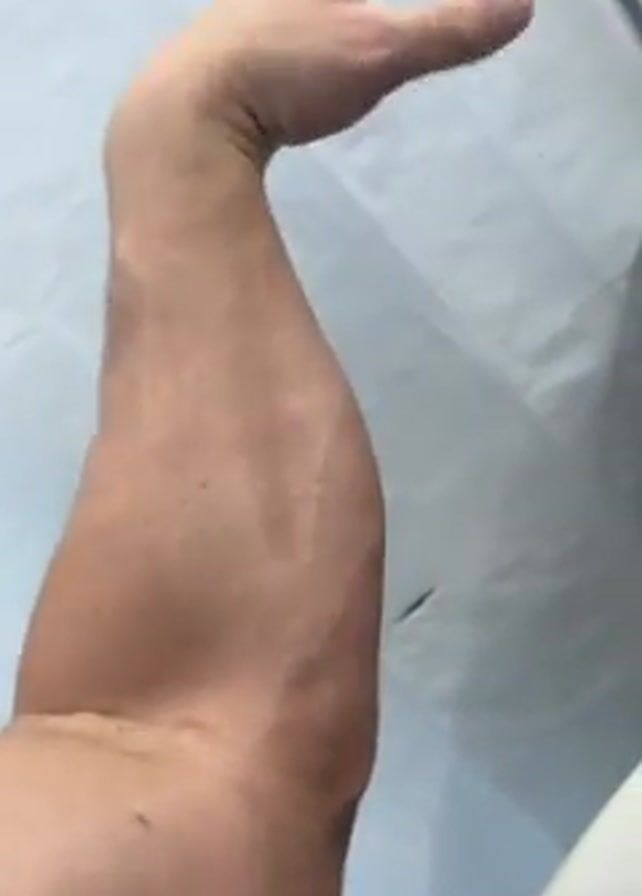 A close-up shot shows a man's left arm, starting from the shoulder down to the hand