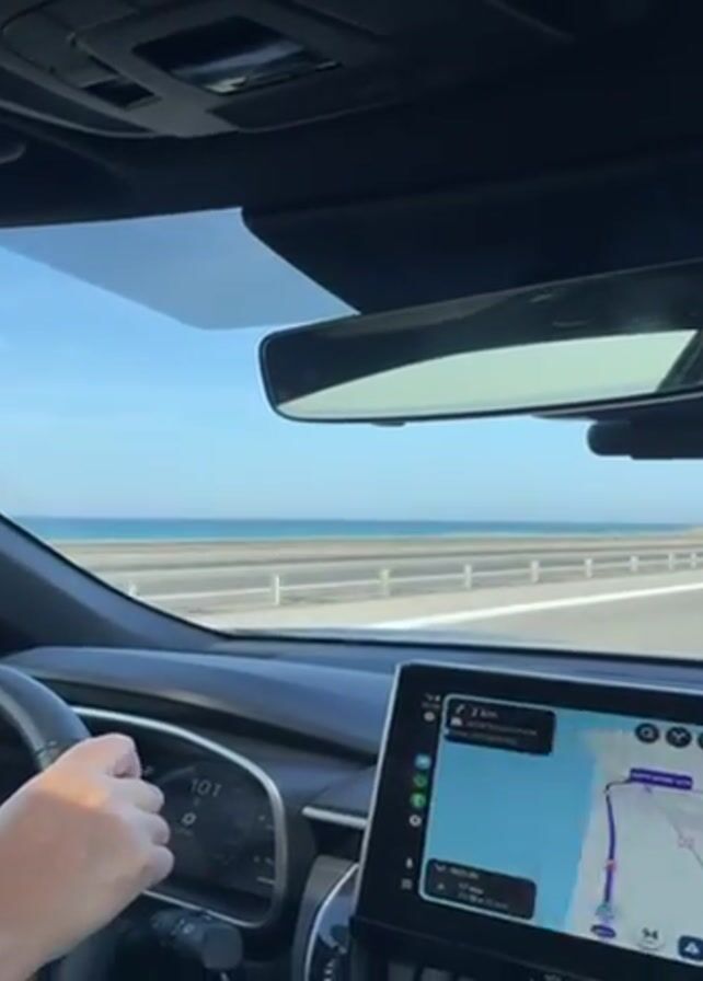 A car is moving along a highway on a bright, sunny day. The ocean is visible to the left of the highway. The car's navigation system shows a map. The dashboard is visible and a hand is on the steering wheel. A pink air freshener is visible attached to an air vent. The sky is blue with very few clouds. Other vehicles are visible on the highway. A "Toyota Relax" sticker is on the windshield.