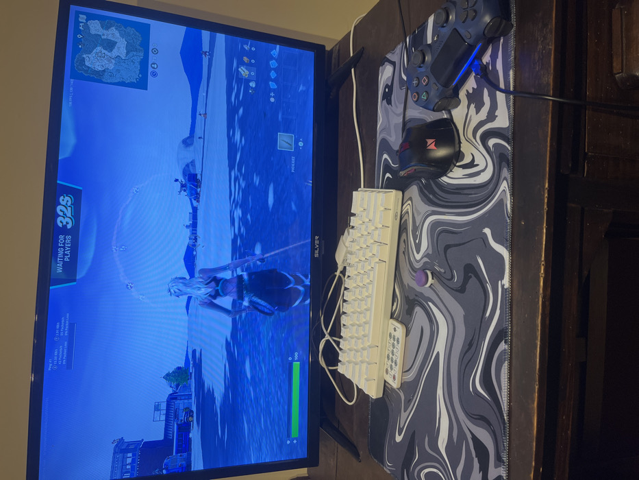 A monitor displays a video game, potentially Fortnite, showing a character in the water