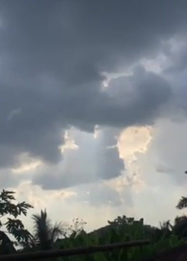The video presents a view of a cloudy sky with visible sun rays breaking through the cloud cover. Below the sky, there are trees and foliage, giving a sense of a natural outdoor environment. The camera seems to be positioned from a slightly elevated perspective, possibly from a building or raised platform. There are no people visible in the frame, but there may be a piece of clothing visible in the lower portion of the frame. The overall mood is somewhat dramatic due to the contrast between the dark clouds and the bright sun rays.