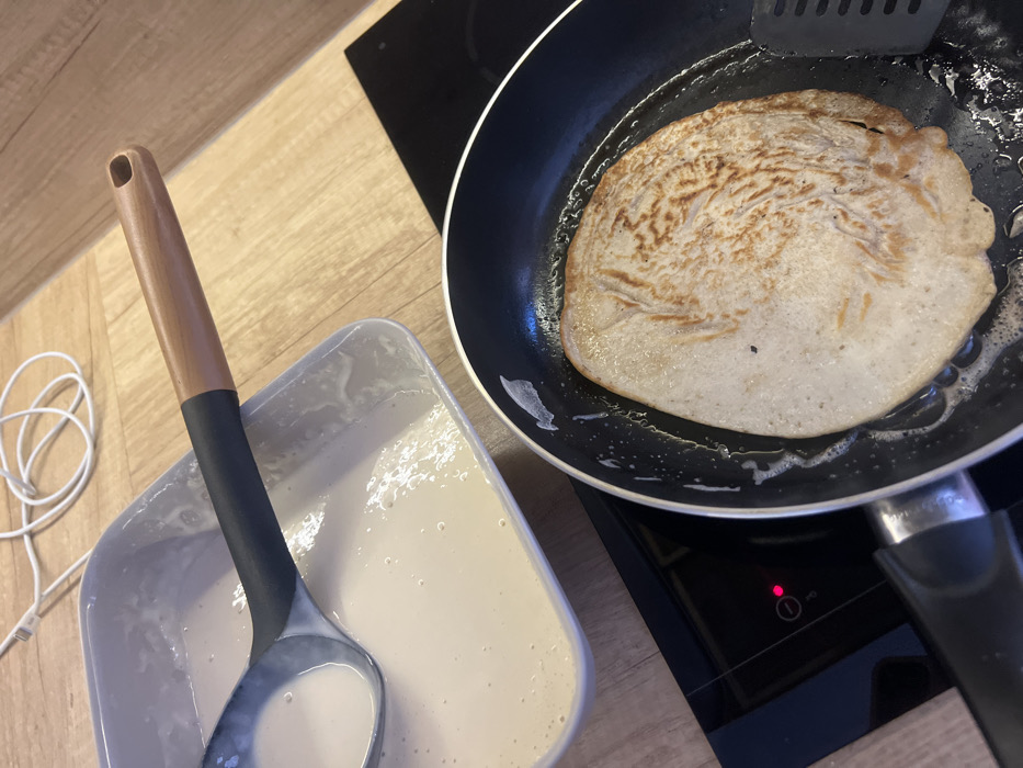 The scene is situated in a kitchen within Plovdiv, Bulgaria. A light-toned wooden countertop serves as the primary surface. In the upper left, a light gray rectangular dish contains a light-beige, liquid batter. A ladle with a dark gray silicone scoop and a light brown wooden handle is partially submerged in the batter, resting across the dish. A white coiled charging cable lies on the countertop near the dish. In the lower right, a black non-stick frying pan rests on a black induction stovetop. Inside the pan, a single pancake is visible, displaying a golden-brown, textured surface on its upper side, suggesting it is actively cooking or recently cooked. Bubbling oil or butter is present around the pancake's edges. A red indicator light is illuminated on the stovetop's control panel, indicating an active burner. No individuals are present in the image.