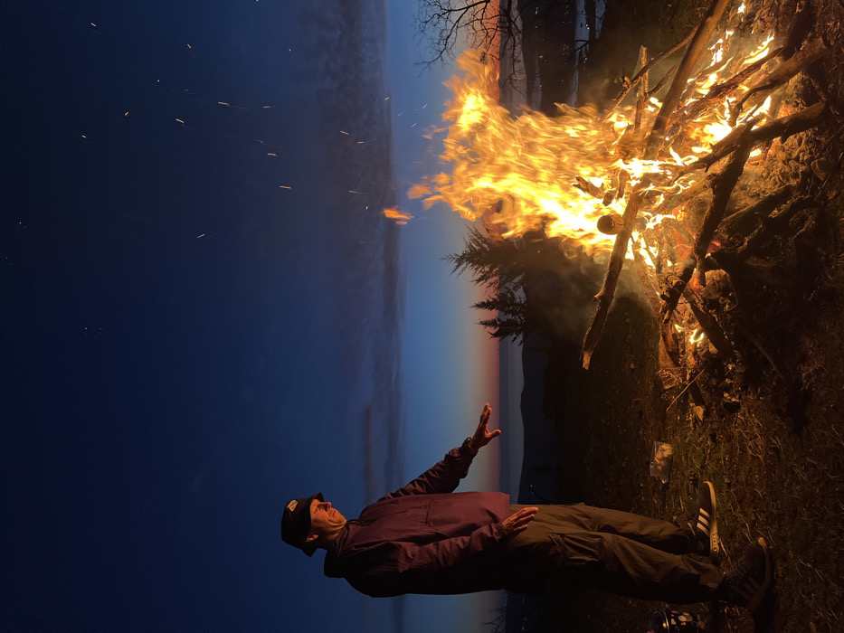 A bonfire blazes beside a twilight sky, casting light on a man standing near the flames
