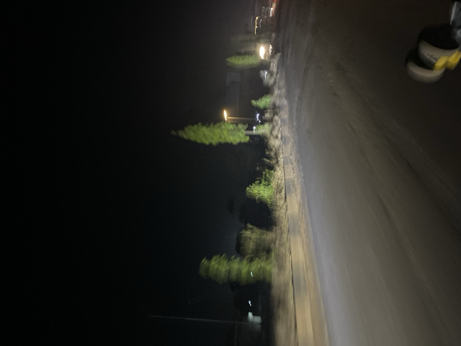 A dark, slightly blurry night scene features a road stretching into the distance on the right. Along the left side of the road, trees and bushes are visible, illuminated by sporadic streetlights. The dark sky and surrounding area create a stark contrast against the lit vegetation. There is some distortion in the image, potentially from motion or a shaky camera. Some cars can be seen with their lights shining on the road.