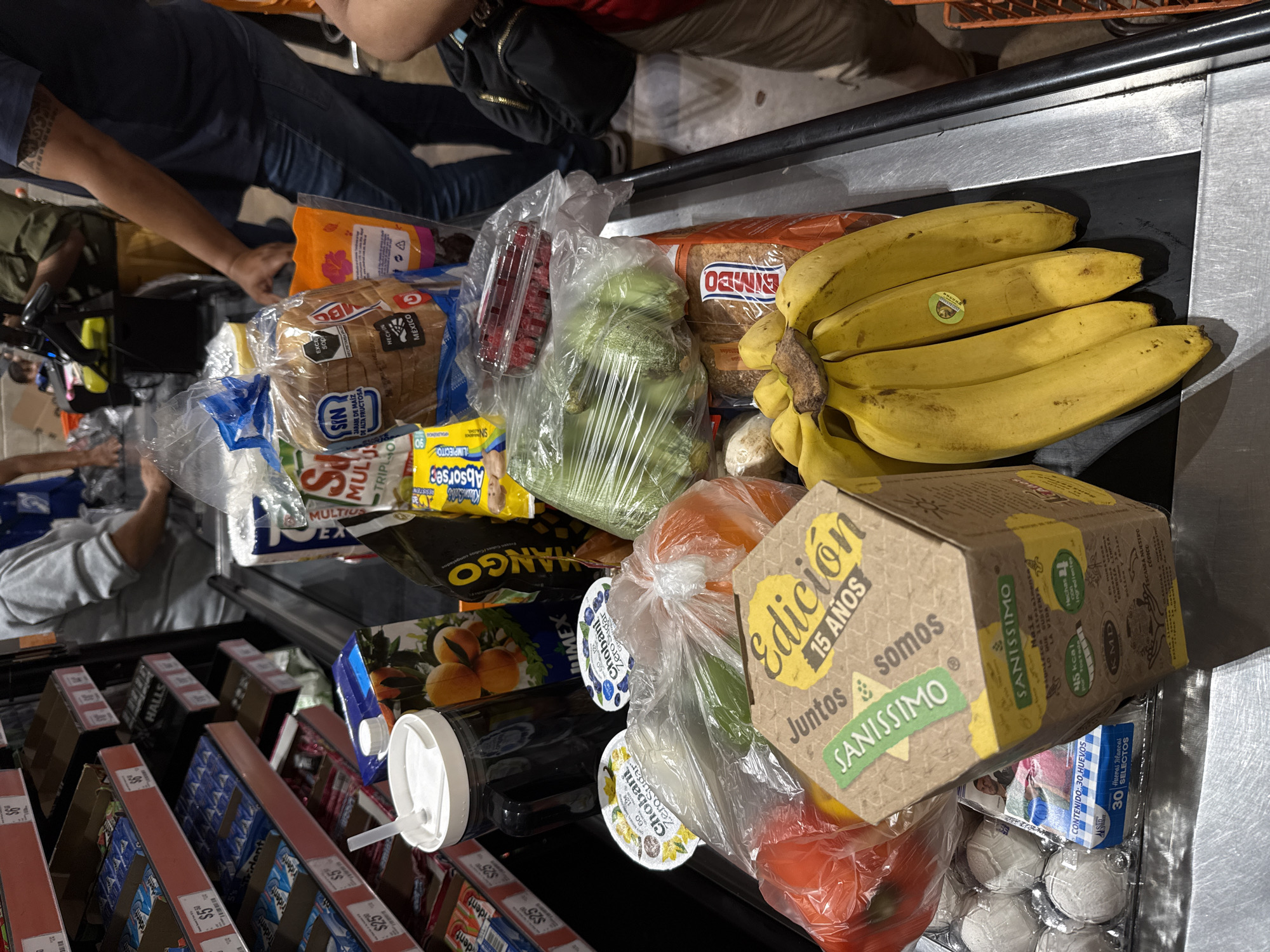 A grocery store checkout line in Veracruz City, Mexico displays a variety of food items on the conveyor belt