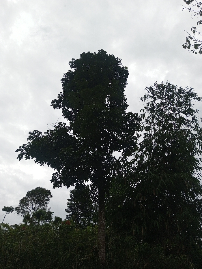This image captures an outdoor natural environment in Cibodas, Indonesia, under an overcast, uniformly grey sky. The scene is dominated by dense, dark green foliage. A tall, broadleaf tree with a visible trunk occupies the center-left, its canopy appearing dark against the bright sky. To its right, another large tree, characterized by long, narrow leaves, possibly a bamboo species, rises, its branches intermingling with those of the central tree. A faint spiderweb is visible stretched between the upper branches of these two prominent trees. The lower portion of the image displays a thick layer of varied green undergrowth and smaller trees. No individuals, artificial objects, or active interactions are present within the frame.