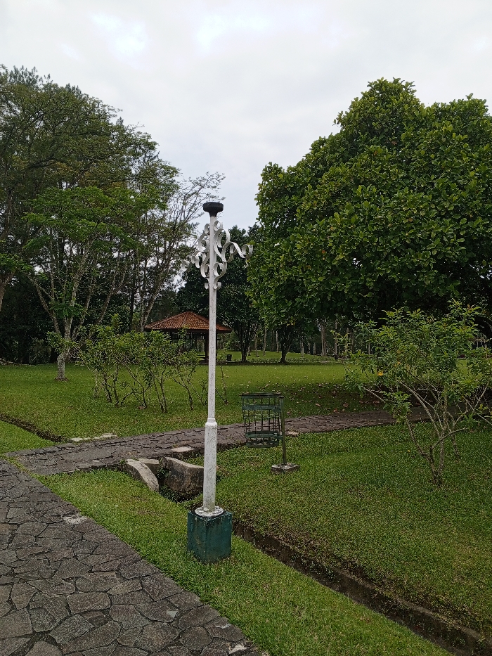 A park scene under a cloudy sky showcases lush greenery and a stone path leading into the distance. A decorative white lamppost stands near the path, next to a green trash can. A small gazebo sits further back in the grassy area, surrounded by trees. The landscape features well-manicured lawns and various bushes, creating a serene and inviting environment.