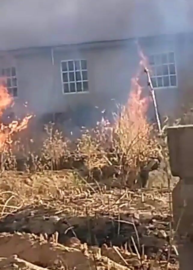 A video depicts a fire burning in a field of dry grass and brush in front of a building. The building appears to be a single-story structure with a gray exterior and white-framed windows. Smoke rises from the fire, partially obscuring the view of the building. A person is briefly visible standing near the fire. The ground is uneven, with trenches or furrows visible.