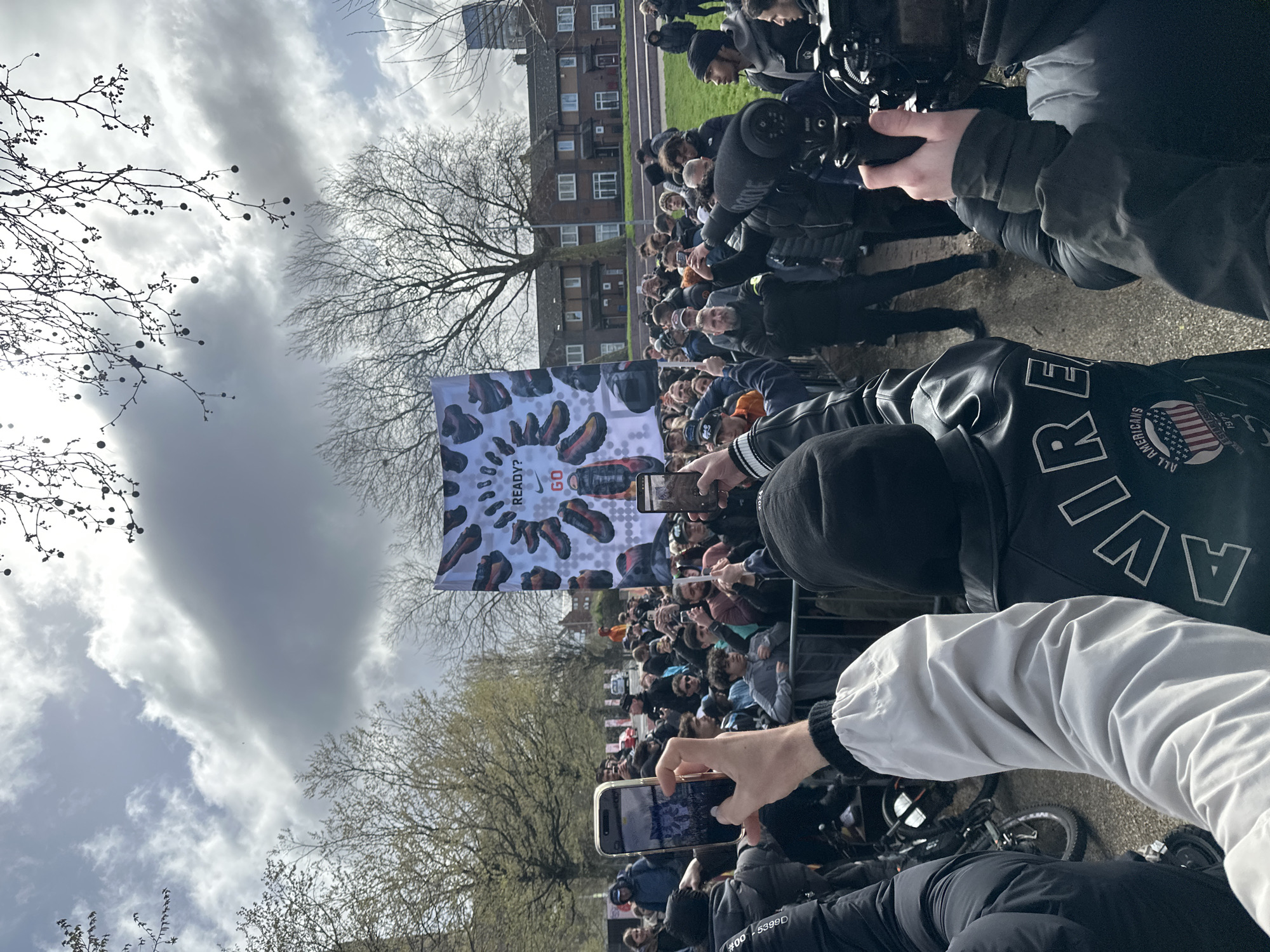 This image depicts a densely packed outdoor gathering of a crowd, predominantly young and male, occurring during daytime under a partly cloudy sky. The location is a public park or urban square in Liverpool, United Kingdom. Central to the scene is a large vertical banner displaying multiple athletic shoes, primarily Nike brand sneakers, accompanied by the text "READY? GO". A distinctive red and black sneaker is prominently featured on the banner. Many individuals in the crowd are holding up smartphones, actively recording or photographing the banner and the event. Several attendees are equipped with professional video cameras and microphones, with a "RODE" microphone clearly visible attached to one camera. The crowd is contained behind metal barriers. In the immediate foreground, the backs of individuals are visible, including one person wearing a black leather jacket emblazoned with a white "AVIREX ALL AMERICANS" logo, and another individual displaying a light grey sleeve. Bicycles are partially visible near the foreground subjects. The background features bare-branched trees, indicating a late winter or early spring season. Behind a grassy area to the right, a row of two-story terraced residential houses with dark roofs is discernible. A taller, multi-story building can be seen in the far distance. The ground in the immediate foreground and underfoot appears to be paved.