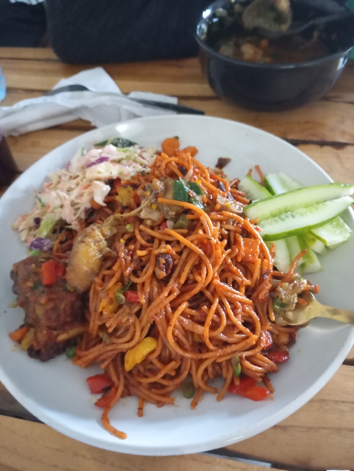 The scene depicts a meal set on a light brown wooden table, in the city of Unknown, Unknown. A white, oval-shaped plate dominates the foreground, laden with various food items. The central portion of the plate features a generous serving of orange-red spaghetti, mixed with chopped vegetables including red and yellow bell peppers and green pieces. A golden fork is partially embedded in the spaghetti on the right side. To the left of the spaghetti, a portion of coleslaw made with shredded white and purple cabbage and carrots is visible. Adjacent to the coleslaw are two pieces of golden-brown fried plantain and a dark, stewed dish containing red bell peppers. Four slices of green cucumber are arranged on the right edge of the plate. In the out-of-focus background, a dark ceramic bowl filled with a soup or stew containing solid ingredients is visible on the upper right. A crumpled white napkin rests on the table, and a dark, indistinct object, possibly a bag or clothing, is present in the upper left. No individuals are directly visible, but the presence of the fork suggests an ongoing or prepared dining interaction.