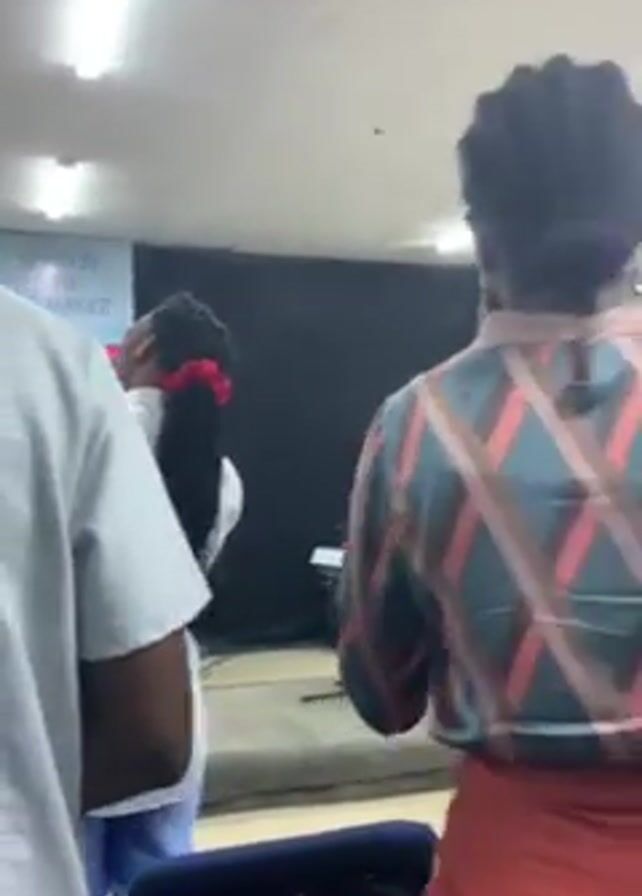 The video captures a scene indoors, seemingly a church or conference room, where a group of people are either observing or participating in an event