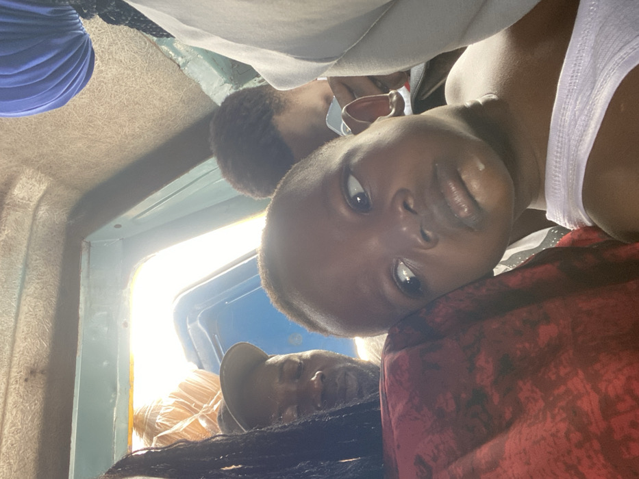 The image presents a crowded interior scene, identified as being within a vehicle in Agani, Nigeria, during daylight hours