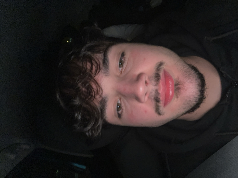 A dimly lit selfie features a young man with curly dark hair and light eyes