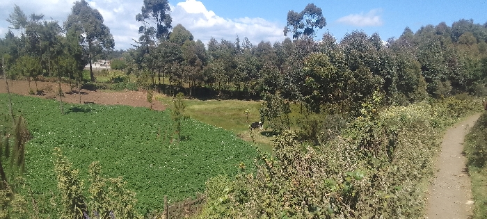 The image depicts a rural landscape in Flyover, Kenya, under a clear blue sky with scattered white clouds. In the foreground, a large cultivated field of green leafy plants with small white blossoms, consistent with potatoes, occupies the left side. Adjacent to it on the right, a narrow, unpaved dirt path extends from the lower right corner, curving slightly into the midground, bordered by dense green and light-colored bushy vegetation. In the midground, beyond the potato field and path, a black and white Friesian-type cow is visible grazing on a patch of green grass. A person, partially obscured behind the cow, is standing upright and appears to be attending to the animal. The background is dominated by a dense treeline composed of numerous tall trees, some appearing to be eucalyptus, with darker green canopies. Faintly visible in the far background on the left, beyond the trees, are elements of human habitation, including a light-colored structure and indistinct vehicles, indicating proximity to a developed area. No overt actions or interactions beyond grazing and standing are discernable.