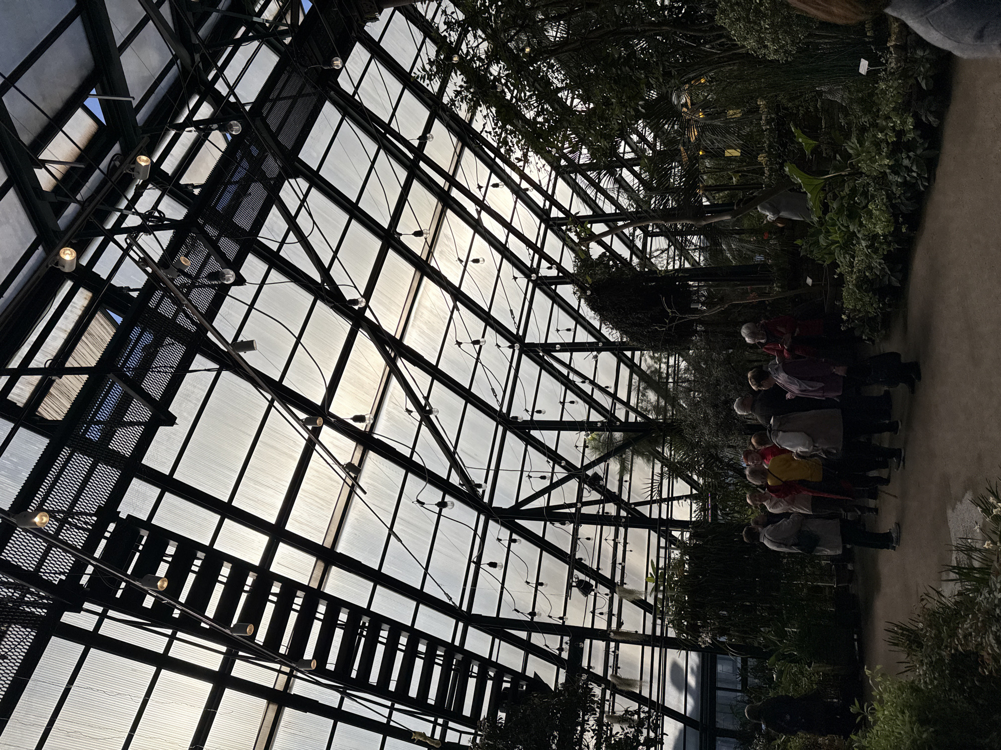 The image depicts the interior of a large conservatory located in the Moscow State University Botanical Garden (Aptekarsky Ogorod) in Moscow, Russia. The scene is dominated by a high, sloped ceiling composed of a dark metal structural framework and translucent panels, likely glass or corrugated plastic, allowing diffuse natural light to enter. An exposed, dark metal staircase with open treads ascends diagonally across the upper-left section of the ceiling. Numerous bare incandescent light bulbs are strung on wires across the metal ceiling structure, some appearing illuminated. Additional, larger spotlights are mounted higher on the framework. The lower portion of the conservatory is a lush, dense botanical environment filled with a wide variety of tropical and subtropical plants, including tall palms and trees reaching towards the roof, various shrubs, potted plants, and ground cover. Plant foliage is predominantly green. An earthen or compacted gravel path forms the immediate foreground and middle ground. A group of approximately ten to fifteen adults is gathered on the path in the middle ground, appearing to observe the plants or engage in conversation. Most individuals are dressed in casual jackets or coats of various colors, including grey, red, yellow, and maroon. One individual is partially visible on the far left, looking towards the plants. Another person's shoulder and arm are visible in the bottom right corner. In the background, beyond the vegetation and through the glass, a portion of a light-colored vehicle, possibly a bus, is faintly visible. Small white informational signs are sparsely placed among the plants.