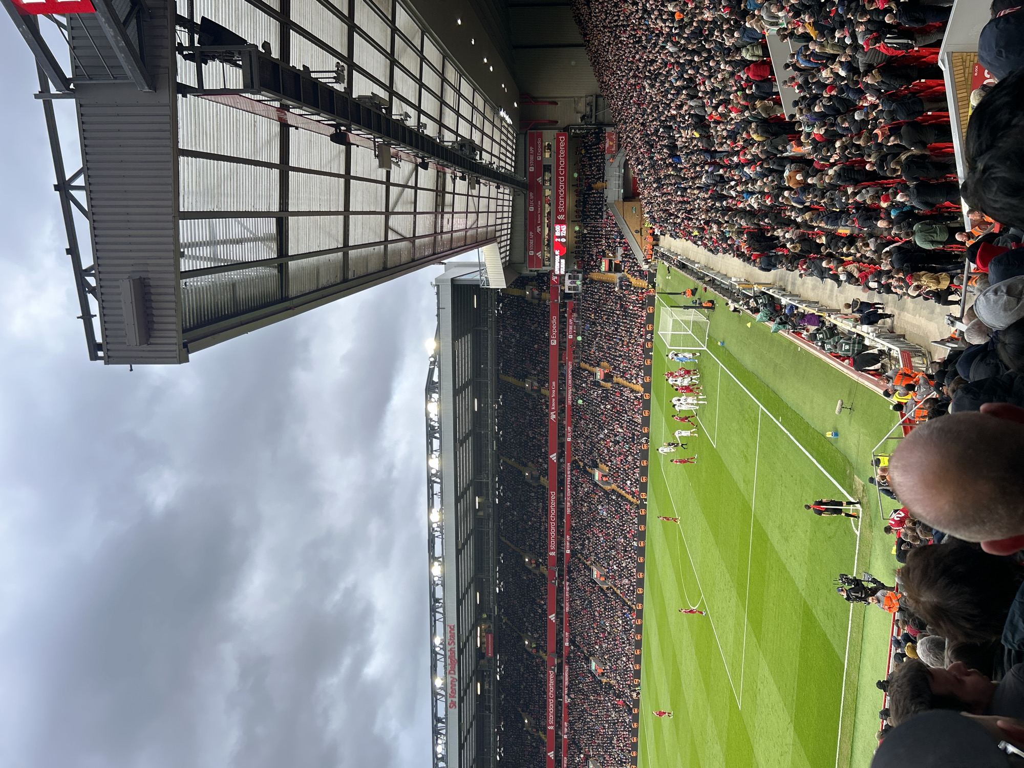 The image depicts a football match at Anfield, the home stadium of Liverpool Football Club, located in Liverpool, United Kingdom. The stadium is filled with spectators. Players in red and white kits are visible on the green pitch. The Sir Kenny Dalglish Stand is identifiable along one side of the field. Advertising for Standard Chartered, Expedia, and other sponsors are displayed along the stands. The sky is overcast.