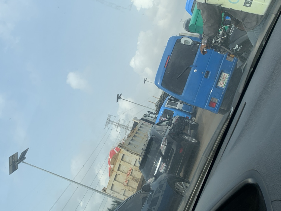 The scene depicts a traffic queue on a multi-lane road in Jakande, Lagos State, Nigeria, viewed from the interior of a vehicle