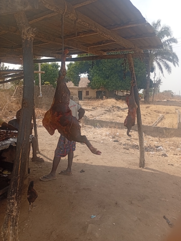 butcher shop in Assai Sabongida, Nigeria, located at latitude 8.864 and longitude 8.442. Two goats are hanging from a wooden structure, which is covered with corrugated iron sheets. A man is standing on the left, wearing a blue and red patterned shirt and blue shorts. He is holding a cleaver and appears to be preparing the goat carcasses for sale. Another person is sitting on the ground on the left, partially obscured by the structure's wooden post. A young chicken is standing in the foreground. The ground is dry and dusty. The environment is semi-rural, with trees and vegetation in the background. The image depicts a typical scene of animal slaughter and meat preparation in a local market. The wooden structure is likely a temporary shelter for protection from the sun and rain. The presence of a cleaver suggests that the meat is being prepared for sale, and the chicken indicates that the butcher shop also sells poultry. The image is a glimpse into the daily life of local communities in Nigeria.