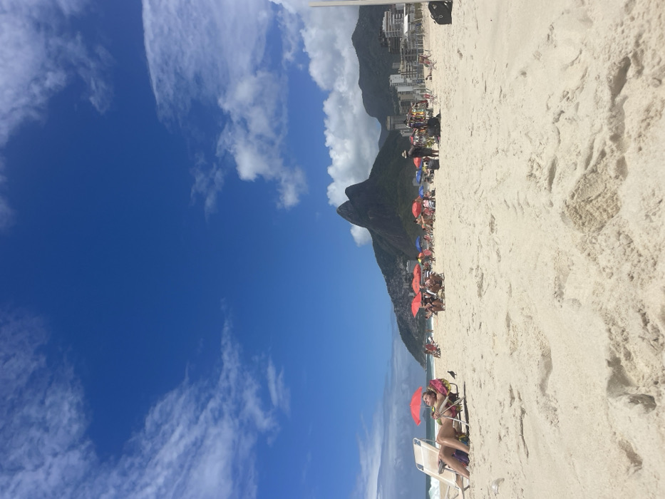 The image depicts a crowded beach scene under a clear blue sky with scattered white clouds. The location is Ipanema Beach in Rio de Janeiro, Brazil, identified by the prominent Morro Dois Irmãos (Two Brothers Mountain) in the background, a large twin-peaked mountain covered in green foliage. In the foreground, light-colored sand dominates the lower half of the frame, showing various footprints and undulations. In the midground, numerous individuals are present on the beach. To the far left, a person wearing a bikini is reclined in a light-colored beach chair beneath a small, open red umbrella. A small, dark bird is positioned near this individual's chair. Further into the midground, a multitude of people are visible, many seated or lying on the sand or in beach chairs under an array of red, blue, and striped beach umbrellas. Waves are observed breaking in the ocean on the left side of the frame. Towards the right-center, a vendor wearing a hat stands next to racks displaying various merchandise. A tall white pole and a dark bag are visible on the far right. In the background, beyond the beach, the cityscape of Rio de Janeiro with numerous buildings lines the base of the mountains. The dominant natural feature is the Morro Dois Irmãos mountain, which rises prominently against the sky. Distant mountains extend to the right, partially obscured by light cloud formations.