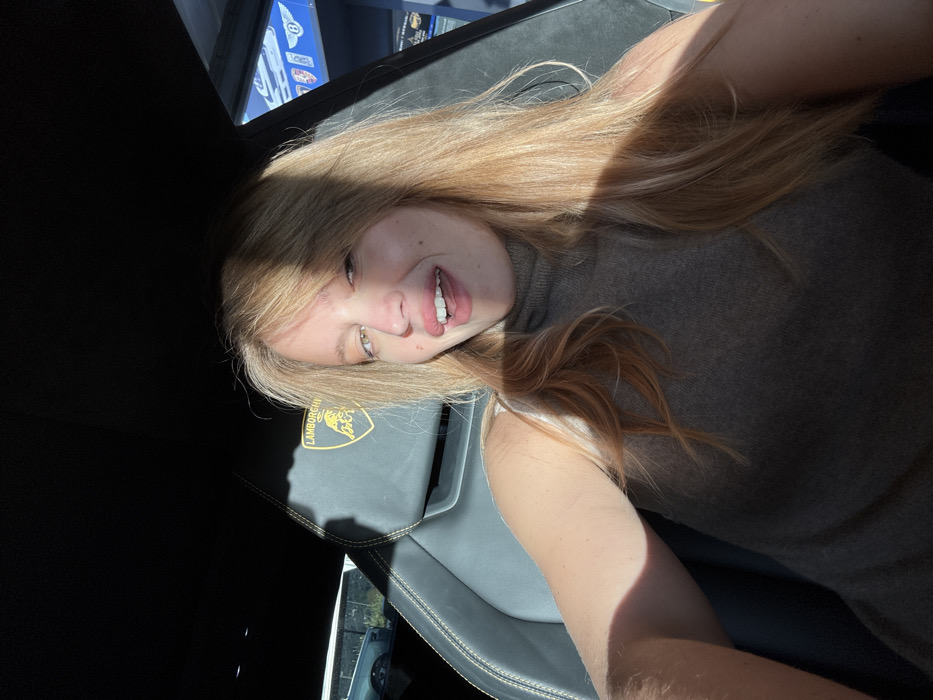 An image taken in Colomars, France, depicts a female individual seated in the passenger seat of a Lamborghini vehicle