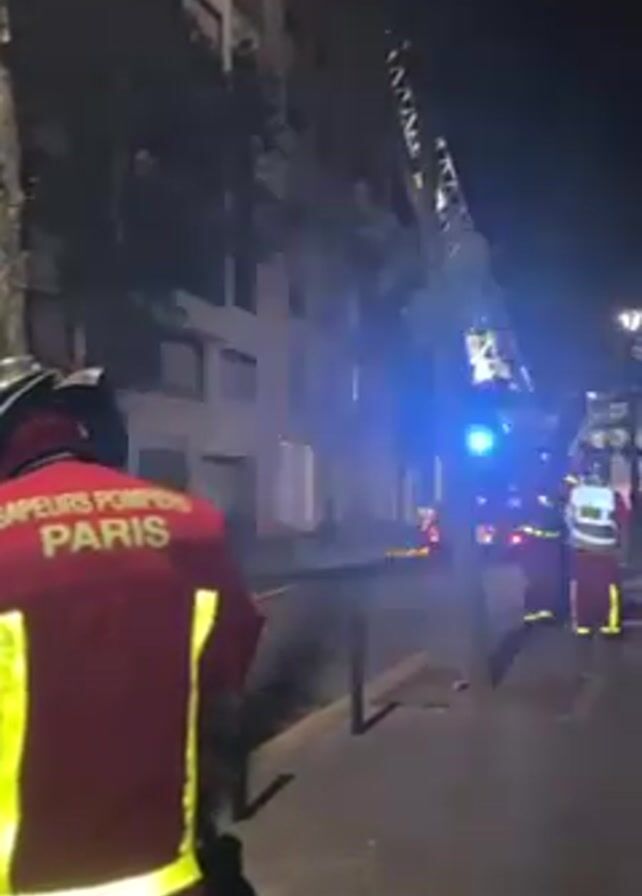 At night, the scene shows the top of a building engulfed in flames. Firefighters are present, dressed in red uniforms with reflective yellow stripes and the words "SAPEURS POMPIERS PARIS" printed on the back. A fire truck is visible, and a ladder is extended towards the burning building. The street is lined with trees and streetlights.