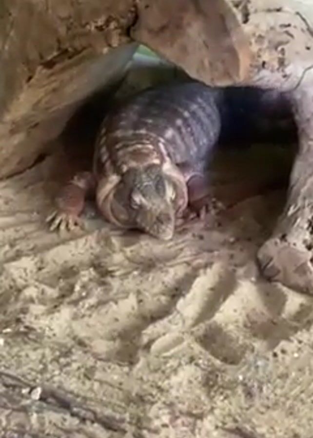 Chuckwalla lizard in a sandy enclosure, partially concealed under a piece of driftwood