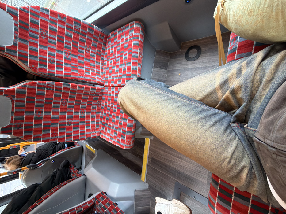 The image displays the interior of a public transport vehicle, identified as a bus, located in Unknown, Unknown. In the foreground, a person is seated, viewing their legs which are crossed at the ankles. They wear faded blue jeans and a dark grey or brown hooded garment. A white sneaker is partially visible on the left foot. To the immediate right, two unoccupied seats are upholstered in a red, grey, and white plaid fabric. A light-colored cushion or bag rests to the right of the foreground subject. In the mid-ground, a passenger with light brown hair, wearing a dark jacket, is visible on the left, seated in a grey and black seat. The vehicle's floor is a grey faux-wood laminate with yellow safety strips. A large window on the right side shows a blurred exterior. Yellow grab handles are present in the background.