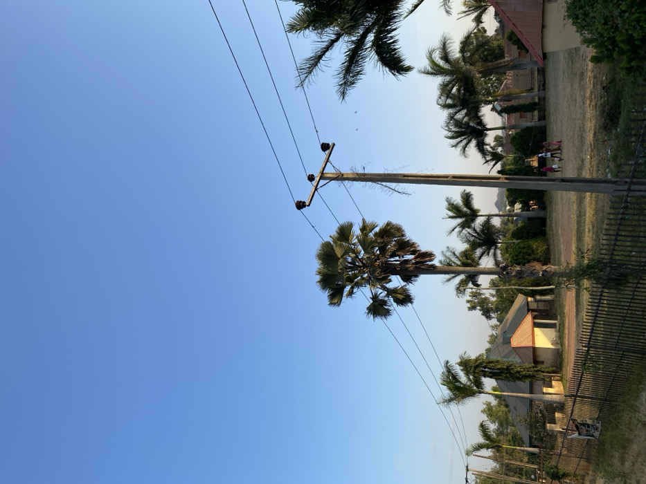 The image depicts an outdoor scene in Kirana, Nigeria, under a clear blue sky with soft, diffuse sunlight suggesting early morning or late afternoon. The foreground features a low, dark-colored metal fence running horizontally across the lower left, partially obscured by green foliage. To the right, a weathered concrete utility pole with three insulators and multiple overhead power lines extends vertically, with dried plant matter clinging to its surface. In the midground, a large, tall Borassus palm tree stands left of the utility pole. To its left, partially hidden by the fence, is a small building with light-colored walls and a reddish-brown, low-pitched roof. An expansive, dry, yellowish-brown grassy field occupies the central and right portions of the midground. Approximately five individuals are visible walking or standing in the field on the right. They appear to be adults or adolescents, with one person wearing a pink top, another a white top, and others dark clothing. They are dispersed, not actively interacting in a group. Several other various palm trees are scattered throughout the midground and background, including species resembling Royal Palms. Another building with a reddish-brown roof is partially visible on the far right edge of the frame. The background shows more buildings nestled among dense green foliage, with distant, hazy hills or elevated terrain faintly discernible on the horizon. The overall environment presents a mix of developed and natural elements.