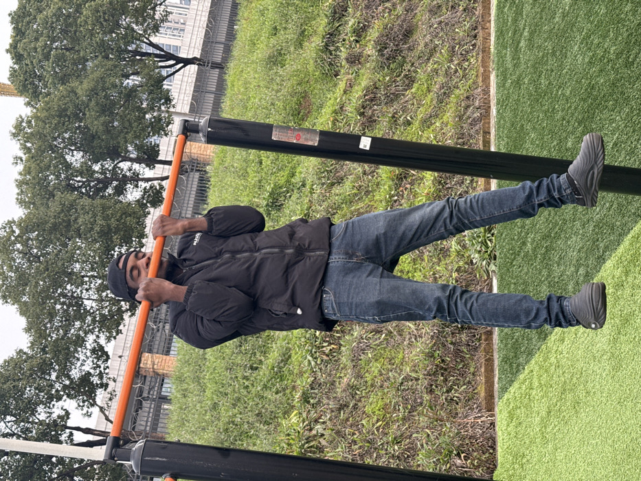 This image captures a male individual performing a pull-up or chin-up on an outdoor exercise bar in Jiangjin, China