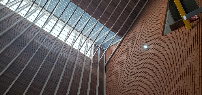 An interior architectural scene in Barquisimeto, Venezuela, specifically identified as the Centro de Artesanía La Tinaja. The image is captured from a low angle, looking upwards at a distinctive ceiling and a brick wall. The upper portion of the frame features an elaborate ceiling structure. This ceiling is characterized by numerous parallel, light-colored beams, likely made of metal, supporting a darker, perforated paneling, possibly for acoustic purposes. A significant portion of the upper right ceiling area is a large skylight, composed of a grid of white structural elements and clear or translucent panels, allowing natural light to penetrate the space. The left and lower-left sections of the frame are dominated by a reddish-brown brick wall. The brickwork exhibits two distinct patterns: the upper part features a curvilinear or concentric circular brick pattern, while the lower part displays standard horizontal courses of bricks. A single, illuminated circular light fixture is affixed to the brick wall within the circular pattern. In the lower right corner, a section of a robust yellow beam or railing is visible, possibly part of a balustrade or architectural support. Directly below this, a red sign with white text, indicative of a fire extinguisher or safety equipment, is partially visible against a dark support structure. No individuals are present in the image. The environment appears clean and well-maintained, suggesting an indoor public or commercial space designed with a focus on natural light and distinct architectural materials.