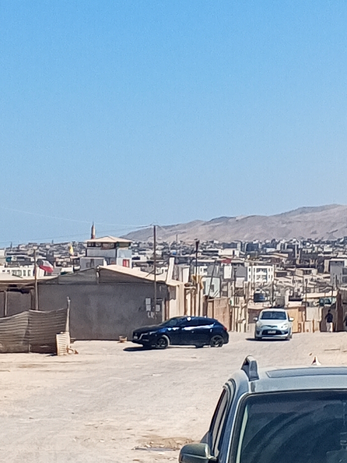 The image depicts a daytime scene in Alto Hospicio, Chile, under a clear blue sky. The environment is arid, characterized by light-colored, rocky hills in the distant background and predominantly unpaved, light brown dirt roads in the foreground and midground. In the immediate foreground, the top section of a dark-colored vehicle, likely an SUV, with visible roof rails, is partially cropped at the bottom of the frame. In the midground, a dark blue or black crossover SUV is stationary or parked on the dirt road on the left, angled slightly to the right. It exhibits a distinct light-colored stripe or reflection along its side. Further down the road, to the right of the dark SUV, a white hatchback or small SUV is visible, facing towards the viewer. The urban landscape in the mid-distance and background consists of a densely packed cluster of low-rise buildings, constructed from various materials including concrete, corrugated metal, and what appears to be unfinished brickwork. Utility poles and overhead wires crisscross the scene. A prominent feature in the mid-left is a building with a flat roof, topped by a slender, cylindrical structure with a pointed or domed roof, resembling a minaret, from which a red and white flag is visible. To the far right, near the white vehicle, two indistinct human figures are discernible, appearing to be standing or walking.