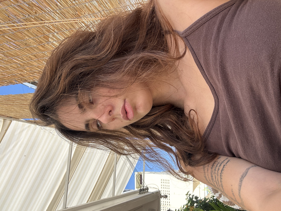 A woman with long, wavy brown hair, wearing a brown tank top, gazes downwards with a slight pout. Her arm has dark horizontal lines. The background consists of a bamboo roof, white awnings, blue sky, and parts of a building. The photo is taken from a low angle, making the woman appear to be looking down on the viewer.