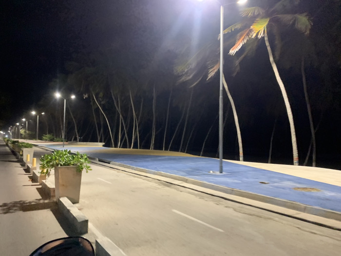 A nighttime scene shows a street illuminated by tall streetlights. Palm trees line the street, swaying slightly in the wind. A blue and tan walkway runs parallel to the road. Concrete planters with green foliage punctuate the roadside. The dark sky and scattered shadows create a serene yet somewhat mysterious atmosphere.