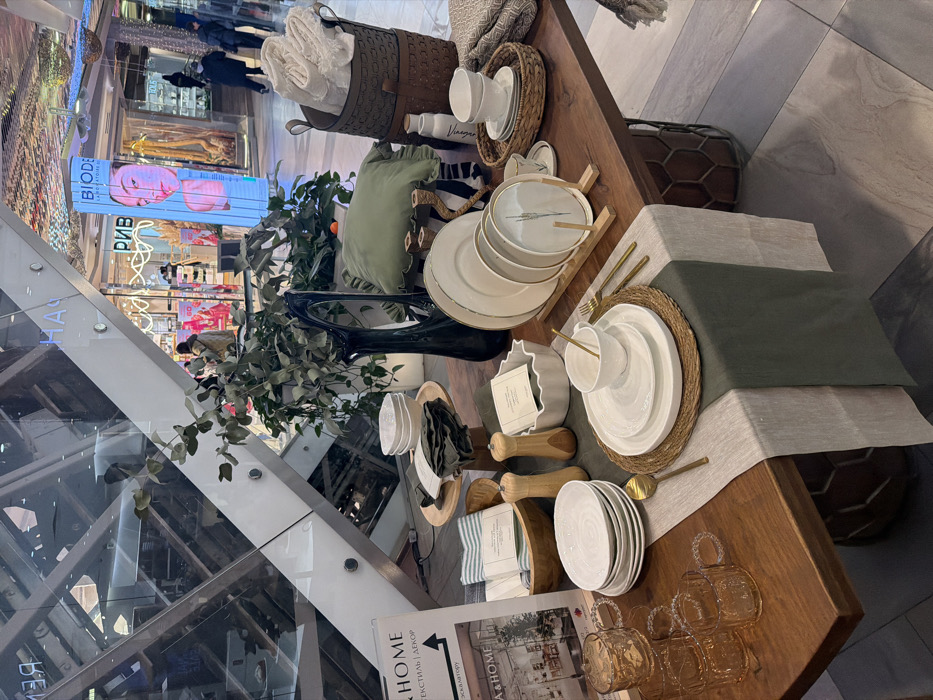 A high-angle shot showcases a wooden table displaying various home goods. White plates are stacked in multiple arrangements, with a few placed on woven mats accompanied by gold-colored flatware. A tall black vase holds greenery, and a folded green pillow adds a soft touch. Towels are bundled in a woven basket, and glass mugs are arranged on the table's edge, alongside a catalog. The background reveals a multi-level shopping mall interior.
