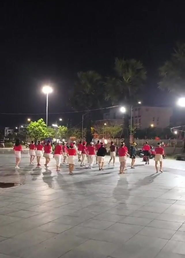- "At night, under streetlights illuminating a tiled public square, a group of about twenty people wearing matching red shirts and light-colored shorts are rehearsing a choreographed dance" by FM-ETbE83, licensed under CC BY 4.0