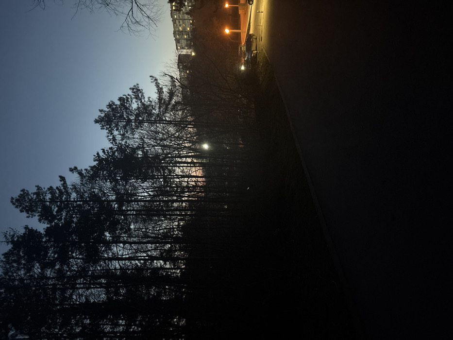 The image displays a transitional urban landscape in Dobrich, Bulgaria, during twilight or dawn. The upper portion of the frame features a blue-grey sky with a faint orange glow on the horizon. A dense line of tall evergreen trees and bare deciduous trees dominates the left and central midground, silhouetted against the sky. A bright, white light source, consistent with a streetlamp, is partially visible through the trees in the mid-right. The lower foreground consists of an unlit, dark asphalt path or road. To the right, a paved area is illuminated by several orange-toned streetlights, revealing at least two dark-colored vehicles parked. In the upper right background, a cluster of multi-story residential buildings with illuminated windows is visible on a higher elevation beyond the tree line. No individuals or observable actions are present within the scene.