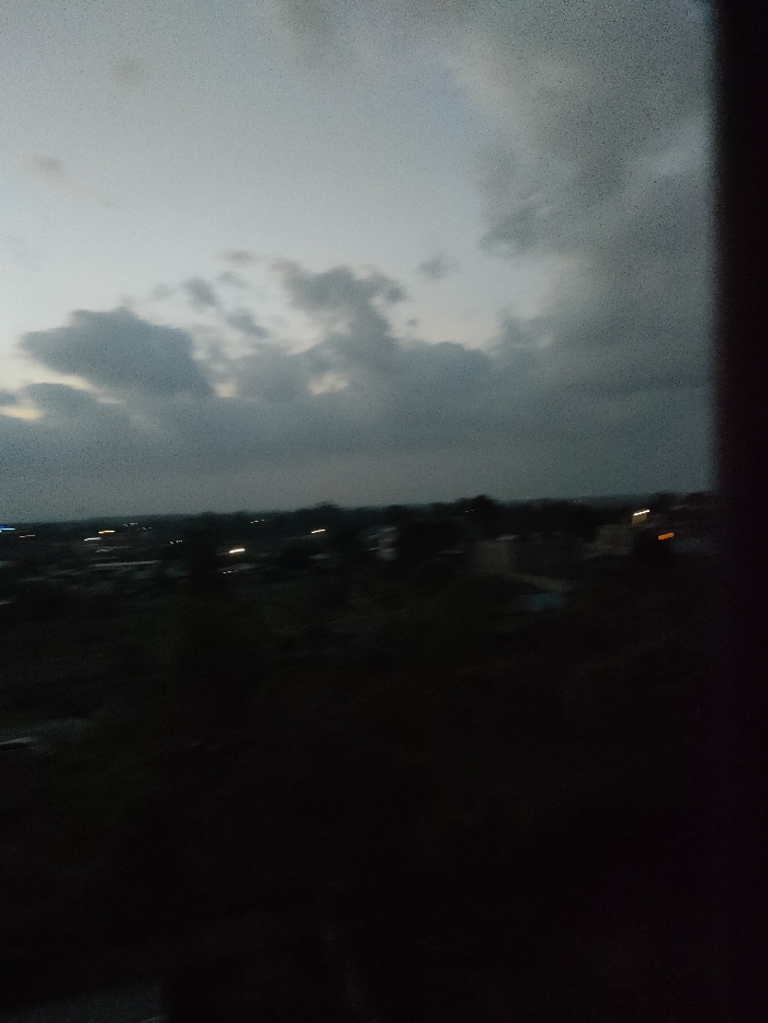 The image presents an elevated, wide-angle view of Juja ward, Kenya, captured during low-light conditions, consistent with dusk or night. The upper portion of the frame is dominated by a heavily clouded sky, displaying variations of dark grey and lighter grey tones. The horizon line is visible beneath the cloud cover. The mid-ground and foreground are significantly underexposed, appearing largely dark, but indistinct silhouettes suggest a landscape populated by trees and structures. Across the distant horizon, a scattering of blurred, artificial light sources is visible, appearing as streaks and points of white and orange illumination, indicative of streetlights, vehicles, or building lights within an urban or semi-urban area. No people are discernible, and no specific actions or interactions are evident. A dark, vertical object, likely a window frame or structural element, partially obstructs the far right edge of the composition.