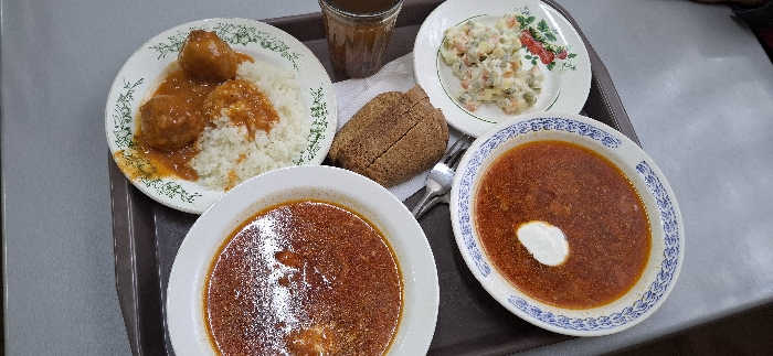 The image displays a meal served on a dark brown rectangular tray, positioned on a light grey surface. The meal consists of five distinct items: two bowls of soup, a main course, a side salad, bread, and a beverage. In the upper left quadrant of the tray, a white ceramic bowl with a gold rim contains a reddish-orange soup, appearing to be borscht, with an oily sheen on its surface. Directly below it, slightly to the bottom center, a second white ceramic bowl, decorated with a blue traditional Russian pattern, holds another portion of reddish-orange soup, also consistent with borscht, topped with a dollop of white sour cream (smetana). In the upper right quadrant of the tray, a white ceramic plate with a green floral rim pattern presents a serving of white rice accompanied by three light-brown meatballs coated in an orange sauce. To the lower right, a smaller white ceramic plate with a floral design featuring red flowers and green leaves holds a portion of a creamy, diced vegetable salad, identified as Olivier salad. Between the two soup bowls and the rice plate, a dark brown, round loaf of bread, likely rye bread, rests on a folded white napkin. A silver-colored metal fork is partially visible underneath the bread and napkin. In the upper right corner of the tray, adjacent to the Olivier salad, a clear glass contains a dark brown beverage, possibly kompot or tea. The scene is consistent with a cafeteria or stolovaya setting in the city of Klin, Russia. No individuals are visible.