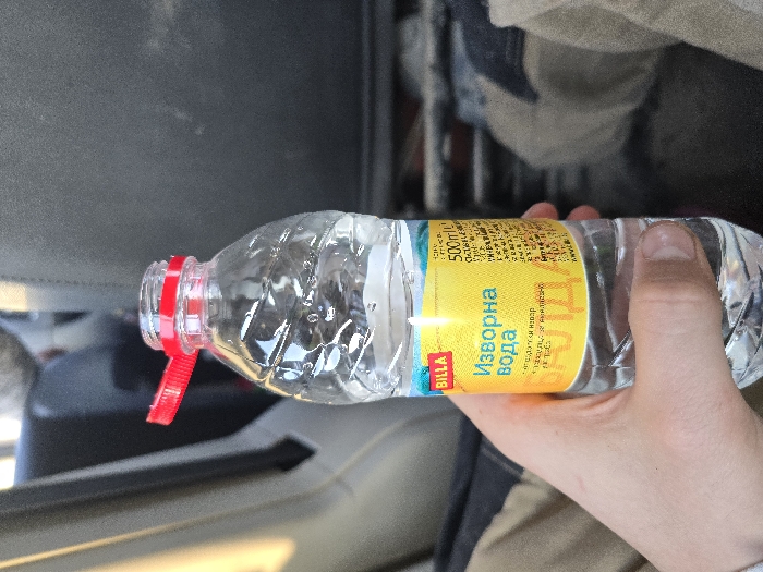 The image depicts a close-up of a clear plastic bottle of water held by a human hand, observed within the interior of what appears to be a vehicle. The background is blurred, showing dark grey or black upholstery consistent with car seatbacks and diffuse natural light from an unseen window. A fair-skinned human hand, with visible knuckles and short fingernails, grips the bottle firmly. The bottle contains a transparent, colorless liquid. A red flip-top cap is open and pivoted backward, revealing the bottle's opening. The label on the bottle is predominantly yellow with a blue band at the top. The "BILLA" brand logo is visible in red on a blue background. Below this, the Cyrillic text "Изворна вода" (Izvorna voda, translating to "Spring water") is prominently displayed. The label also indicates a volume of "500ml." While the prompt mentions "the city of Yazdach, Bulgaria," the visual evidence in the image itself does not provide specific geographical markers to confirm this location. The scene is confined to the interior of a vehicle, with no external views.